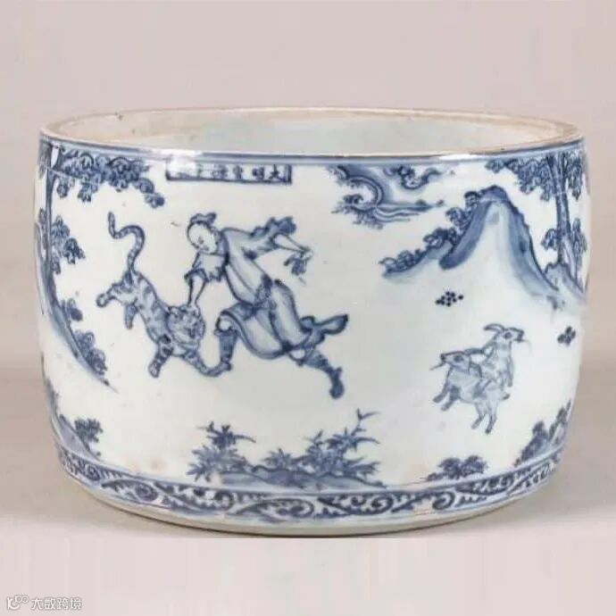 Leeuvarden Princessehof陶瓷博物馆藏有一只明嘉靖 青花人物故事图笔筒、洁瑞堂也收藏了一对清康熙 珐琅彩人物故事图盘以及英国Cohen家族递藏的清乾隆粉彩人物故事图鱼缸,皆绘为“李存孝打虎图”,以兹参阅。