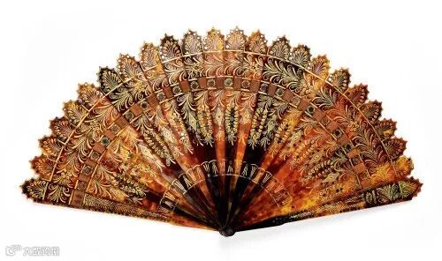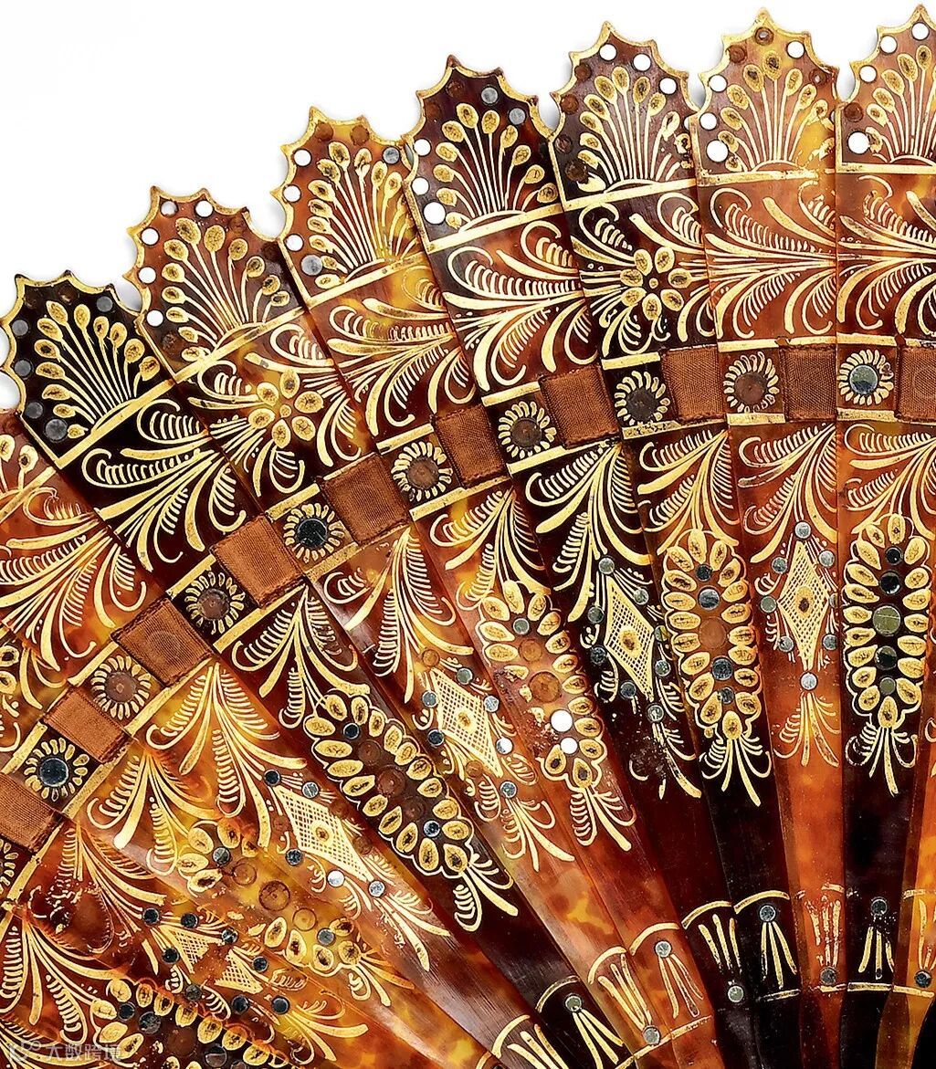 19世纪中后期,以英国为代表的欧洲国家社会稳定、经济繁荣,华丽之风再度盛行。贝母、螺钿等珍稀材料常用以扇骨,蕾丝、绸缎和薄纱制成扇面,镀金、金银彩绘、珍珠及金属镶嵌也广为采用,珍贵材料,精工细琢,完美诠释着欧洲上流社会与新兴阶层的斑斓华彩。