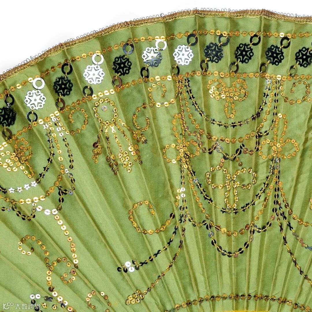 扇骨镂空并饰点状织物,绿绸扇面以金属小圆片饰璎珞纹。配玳瑁贴皮盒。