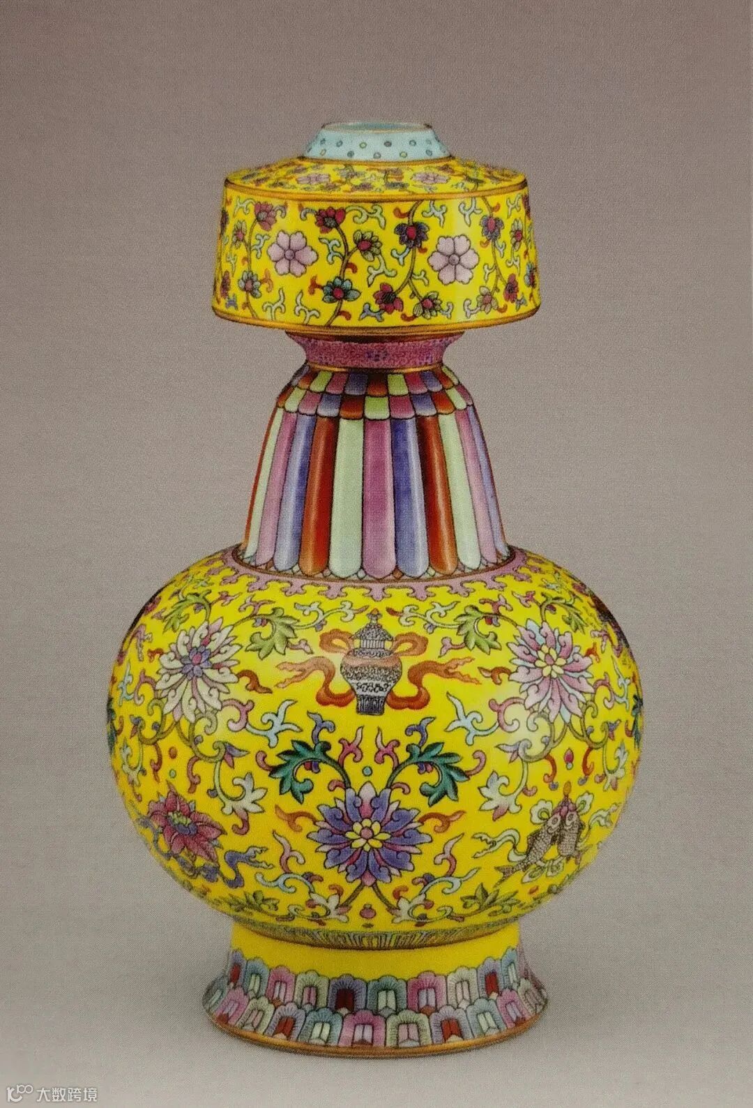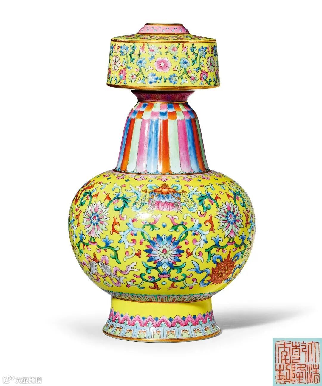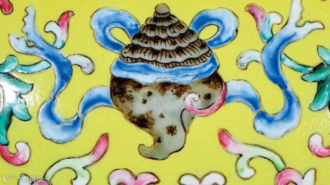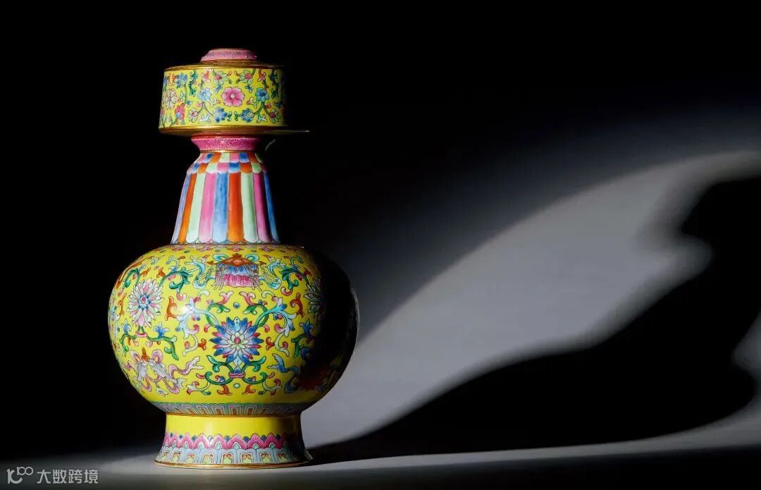LOT842 清乾隆 御制黄地洋彩莲托八吉祥纹贲巴瓶物是一件将西藏地区传统造型与宫廷御瓷完美结合的器物,更是汉藏文化融合的历史见证。其秀美的造型、精细的绘工、协调的色彩与精美的纹饰浑然一体,体现出西藏地区传统造型与内地悠久的陶瓷烧造工艺高度完美的融合。它不仅能带给我们视觉上的享受,也展示了中国历史文化内涵的魅力所在。