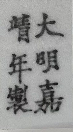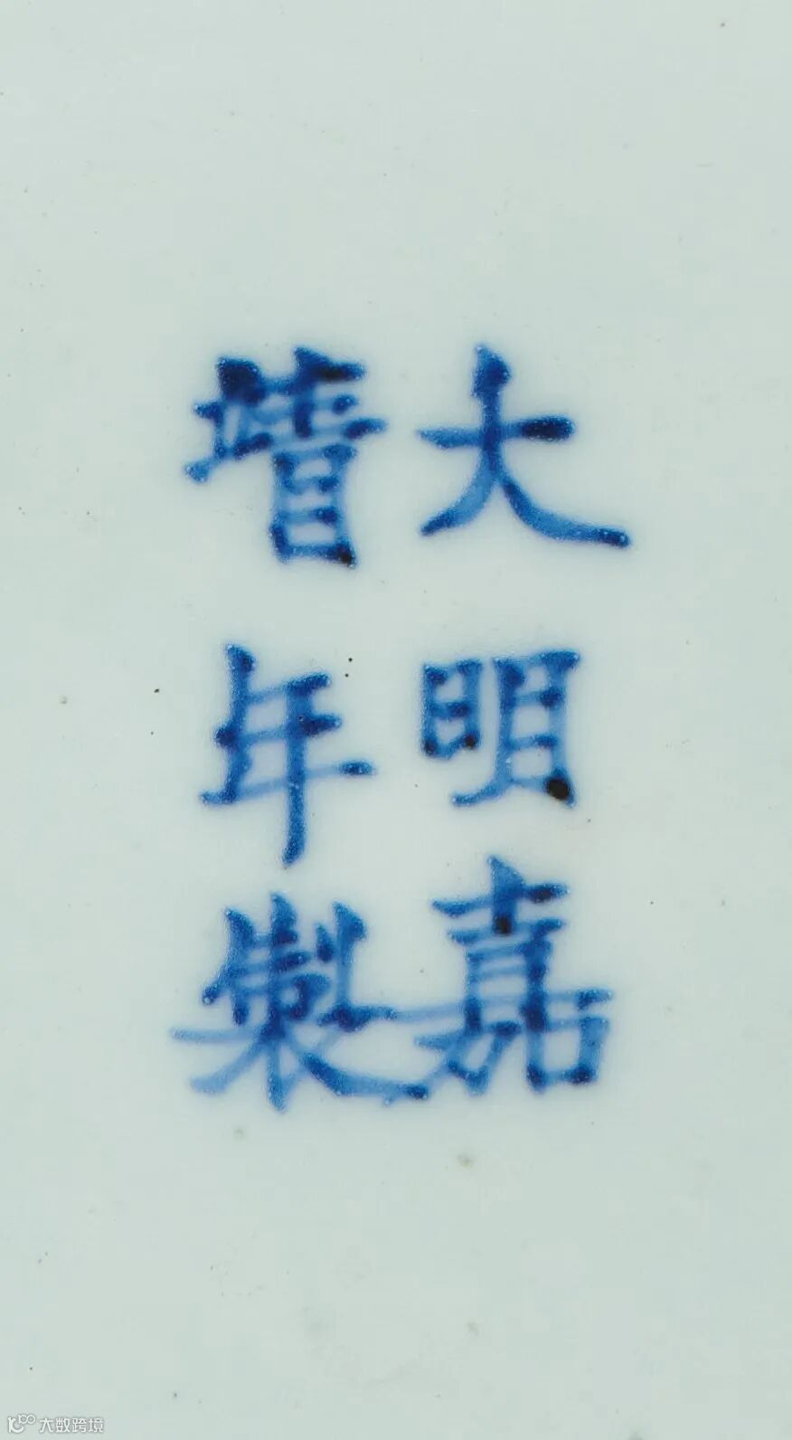 底部所见胎骨厚重坚致,圈足内均施亮青釉,厚润莹美,中心青花楷书『大明嘉靖年製』六字双行楷书款,色泽浓妍泛紫,笔力遒劲,深透胎骨。对比香港佳士得于1993年3月22日释出的一只明嘉靖红地黄彩云龙海水纹罐,其形制、尺寸及纹饰与本件拍品一致,尤其值得注意的是,两者款识书写不管是布局还是起笔停顿都完全一致,由可知当为同一书款人所写。现将两件拍品款识作一对比,展示如下: