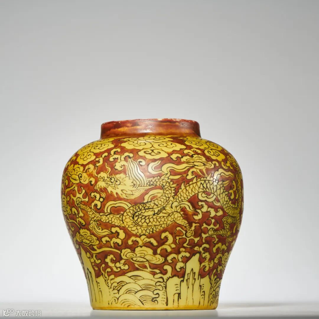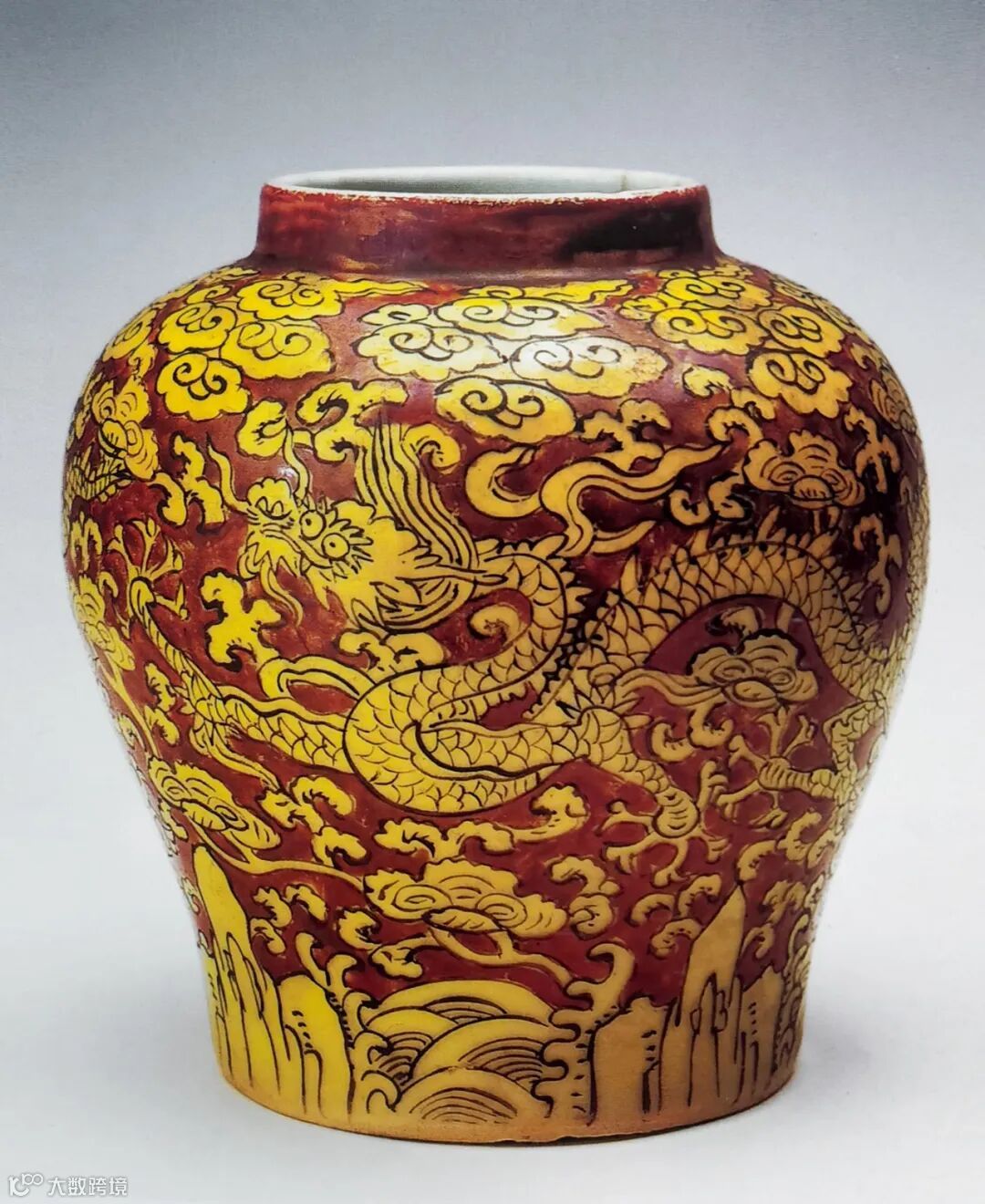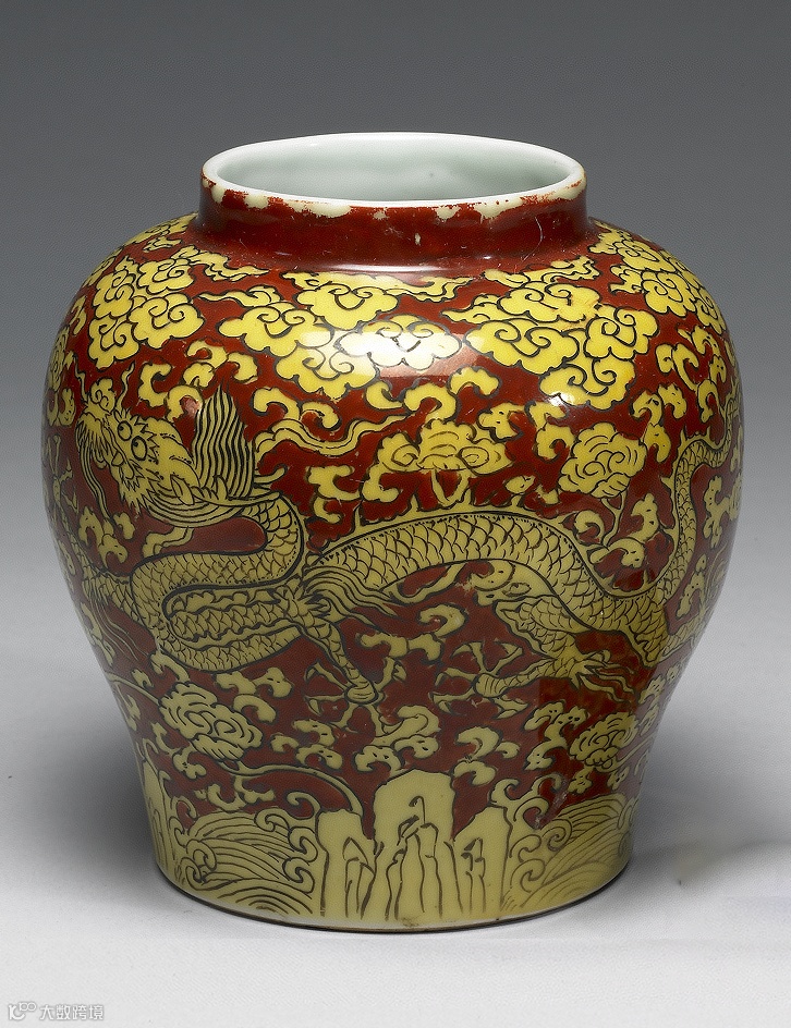 查阅公私资料,红地黄彩云龙海水纹罐可见藏于数处重要博物馆及私人收藏,皆为馆藏珍宝。法国集美博物馆也有相同纹饰及相同工艺的藏品,并出版于《东洋陶瓷 第八卷》。