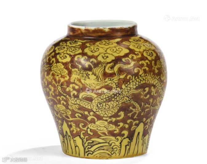 明代嘉靖皇朝的“黄上红”珍瓷,是我国宫廷御用瓷发展史上的一个珍贵彩瓷品种,由于其生产工艺十分复杂,而仅供宫廷使用,现存世量十分稀少而格显珍贵。本次春季拍卖会(一)征集了一件明嘉靖红地黄彩云龙海水纹罐。