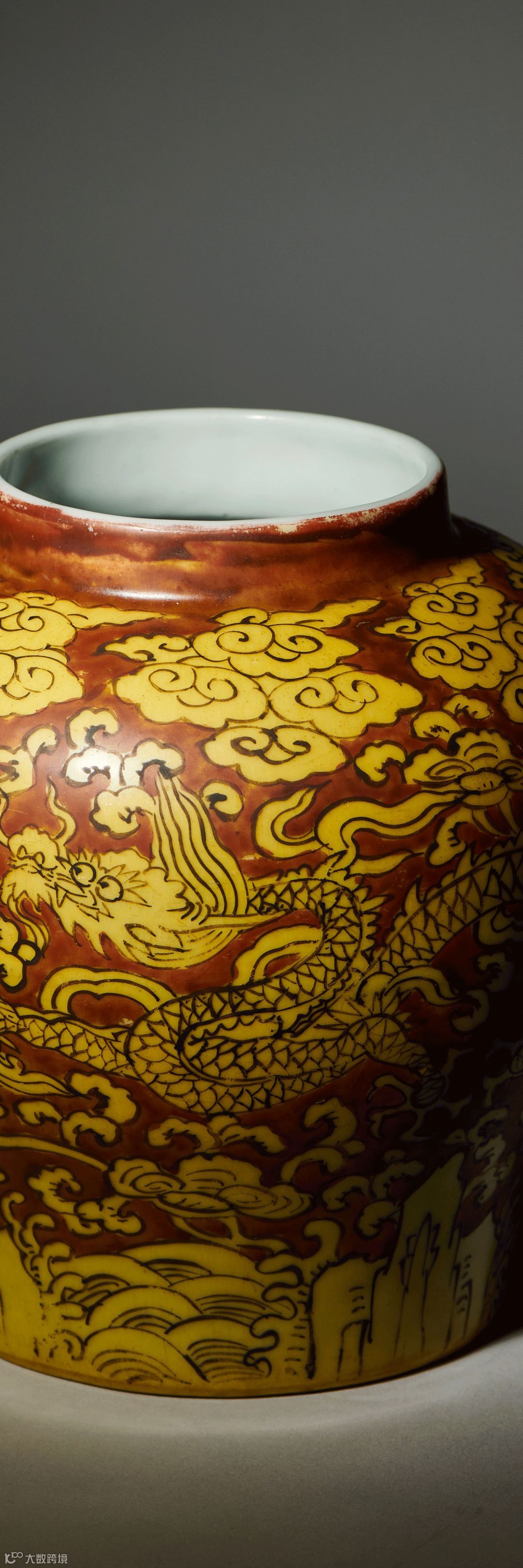 Lot 835明嘉靖 红地黄彩云龙海水纹罐(局部)