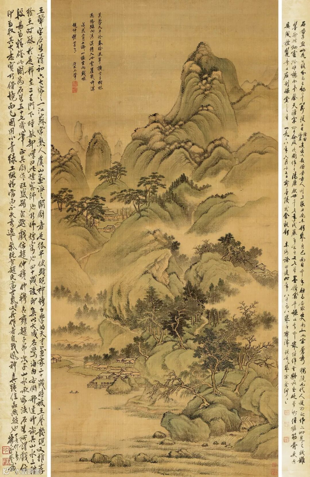 此件王翚《春阴湿翠》采用平远法构图,画面质朴、秀润、飘逸、流动。作者配以小青绿设色,画中树石林立,村院若隐若现,观之此画可行、可居、可游、可望实为中国文人画典型代表。此画在清道光年间就已被当时举人有“传真画师”之称的张衡(字莘田)所收藏。1998年又经我国书画鉴定界泰斗徐邦达先生客居南京时鉴定题跋“石谷子画山水大致分三期:四十以前从二王(烟客、湘碧)变出,又多仿学古人,刻意求工,尚未形成自己面目。中年融合各家,出入南北两宗,苍秀独绝。而代人捉刀之作亦时见之,较难鉴别。然细审终非杨西亭、蔡天涯等所可企及。此图作于清康煕二十七年(戊辰),年五十又七,笔墨精当平稳正奇,中岁佳作无疑。及至晚笔,则仅存筋骨更自具风标,览者又应别眼赏之矣。一九九八年六月十七日,寓金陵客舍观题。东海徐邦达时年八十有八岁。手腕迟钝书不成字,奈何奈何!”。后被著名鉴定家萧平先生所见,先生欣然又题。“不失秀逸之气,即有赵氏高古之气象,又具作者自我风神。真迹佳品无疑也”。可见此画不失为一件流传有序,备受推崇的国宝级作品。