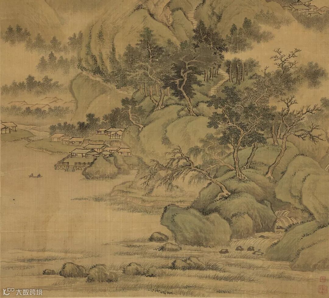 作者以平远装饰手法绘山石、屋宇、树植、人物等,设色典雅秀丽,绚烂清雅兼具宫廷装饰画风和文人雅致气息,这也恰为仇英的艺术特色跻身文人画坛成为一代宗师的最好展现。