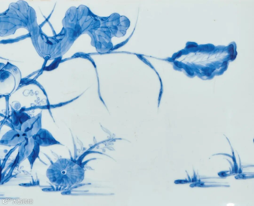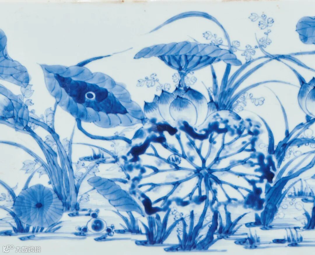 整体纹饰绘画运用青花墨分五色的装饰技法。这种特殊的绘法出现于明末,根据画面需要将不同浓度的青花料水均匀平涂在所需部分,有如国画中“墨分五色”的效果,使画面的前后透视、内外结构都层次分明地表现出来。康熙青花中的分水技法这时已经非常成熟,尤其是康熙中期,采用了珠明料作为青料以后,颜色呈翠蓝色,浅色的分水处清透淡雅,深色的部分深沉浓郁,极具特色。