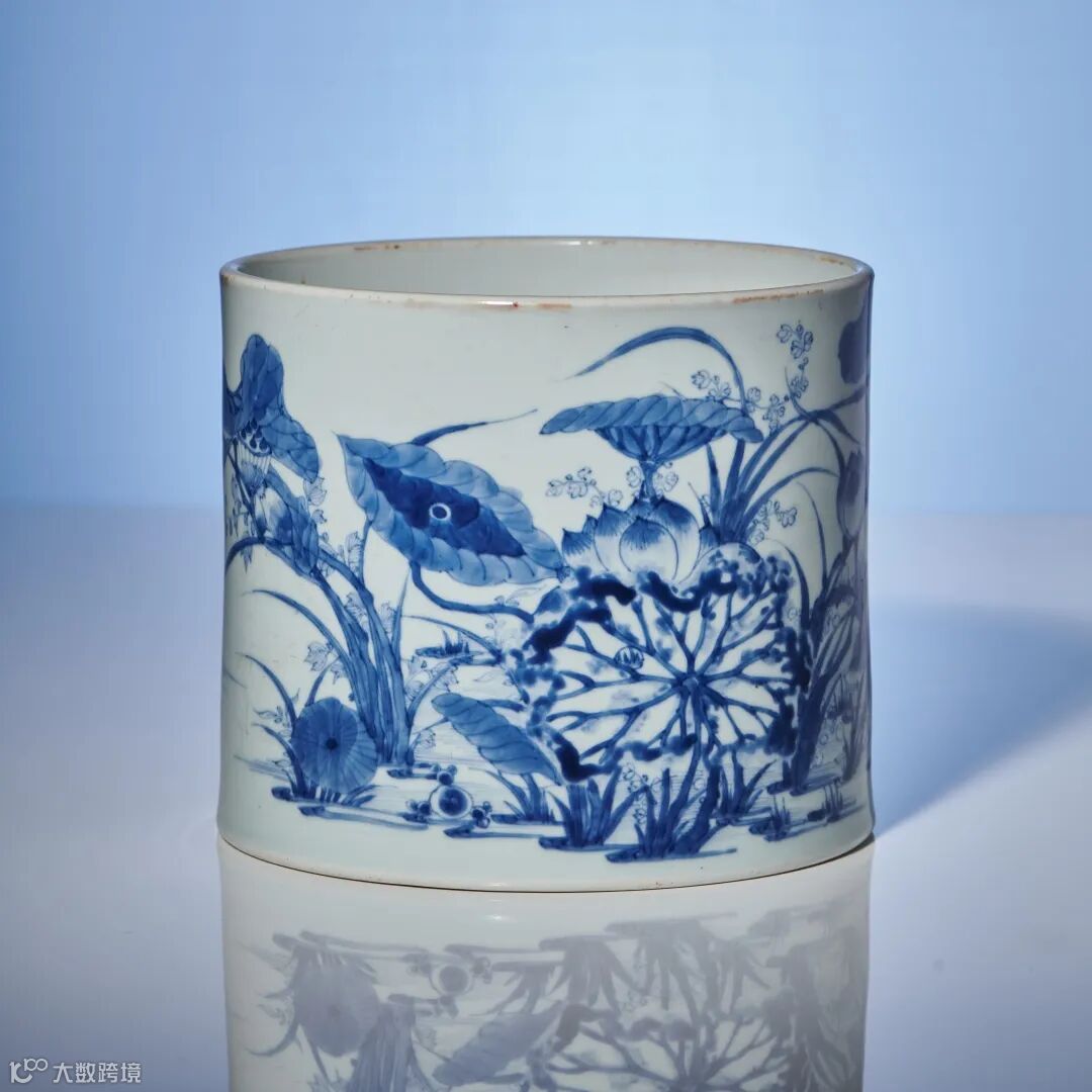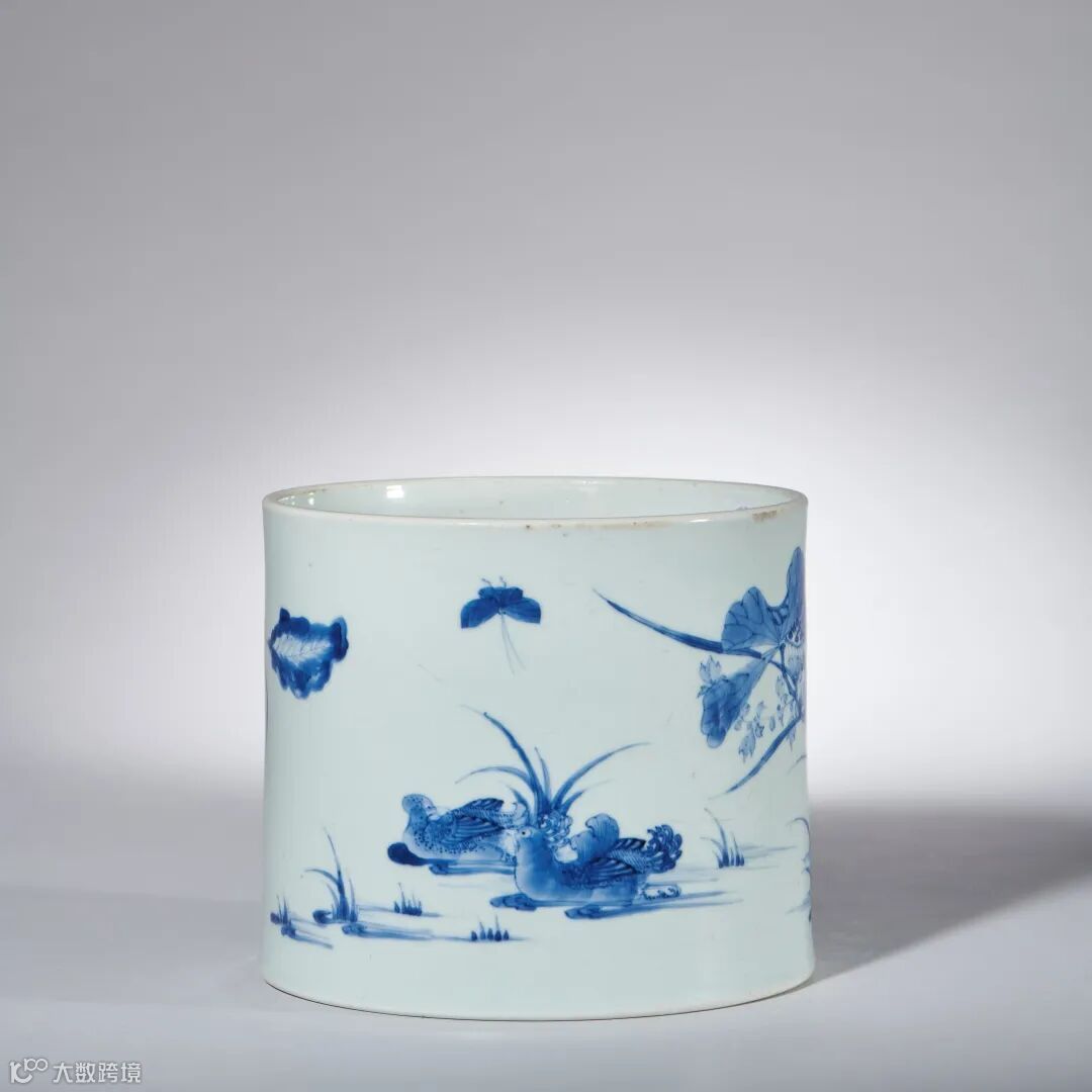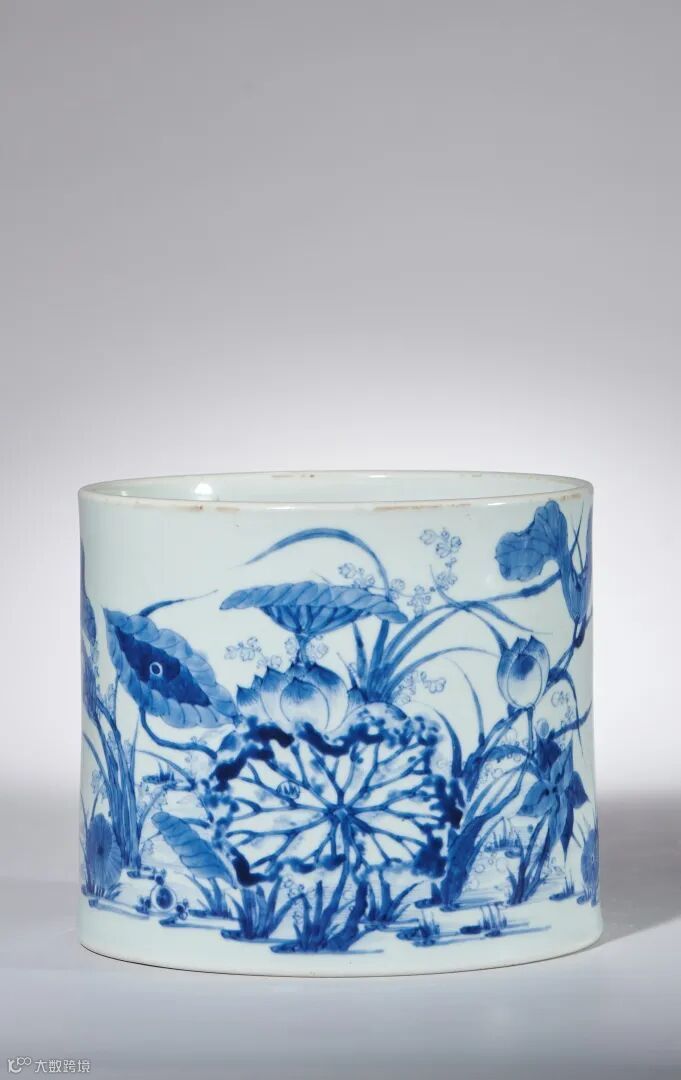 此笔筒呈直筒形,玉璧足,旋削整齐,釉质莹润,通体施泛青亮白釉,釉面莹透滋润平滑。外壁通景青花描绘荷塘鸳鸯,画面运用写实的手法,将荷花、荷叶、莲蓬、花茎描绘得惟妙惟肖,呈现出一派夏日荷塘的淡雅景致。青花发色沉稳而不失艳丽,墨分五色,层次分明,将荷叶的阴阳向背,荷花的花荣花谢表现得十分准确,神态惟妙惟肖。