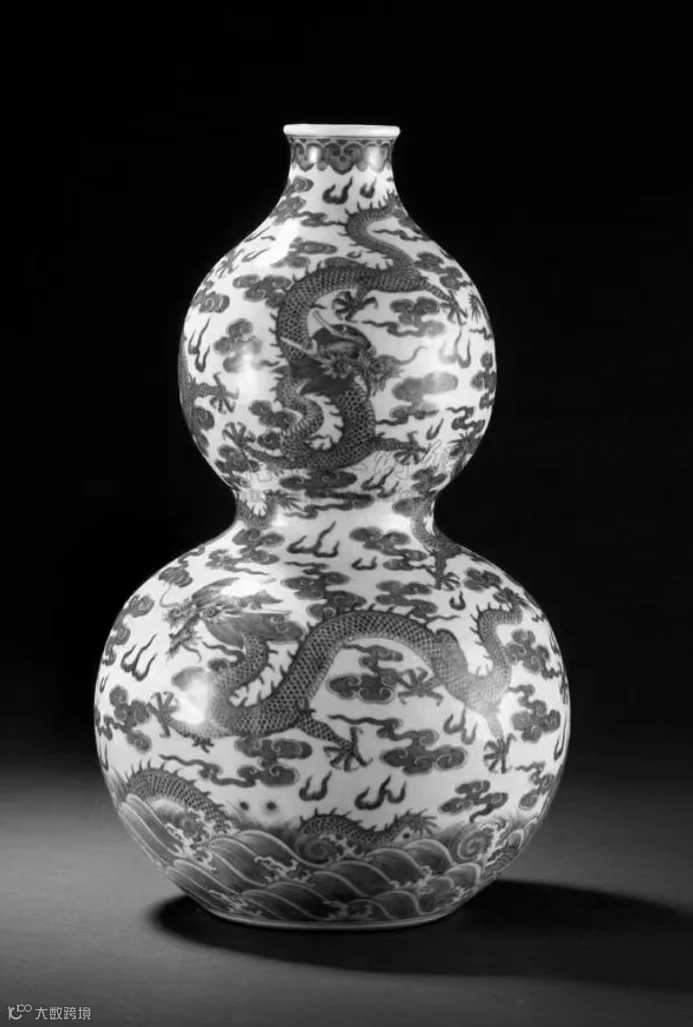 左图:北京保利 2010 年 12 月 5 日 编号 4552 清嘉庆 青花海水九龙葫芦瓶