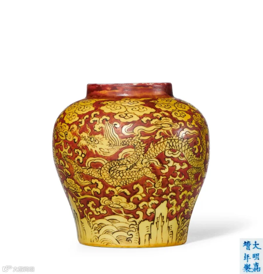 左图:明嘉靖 红地黄彩云龙纹罐(北京故宫博物院藏)