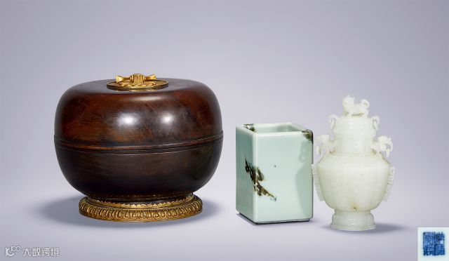 仿石纹釉方笔筒黄花梨捧盒,白玉夔龙纹盖瓶