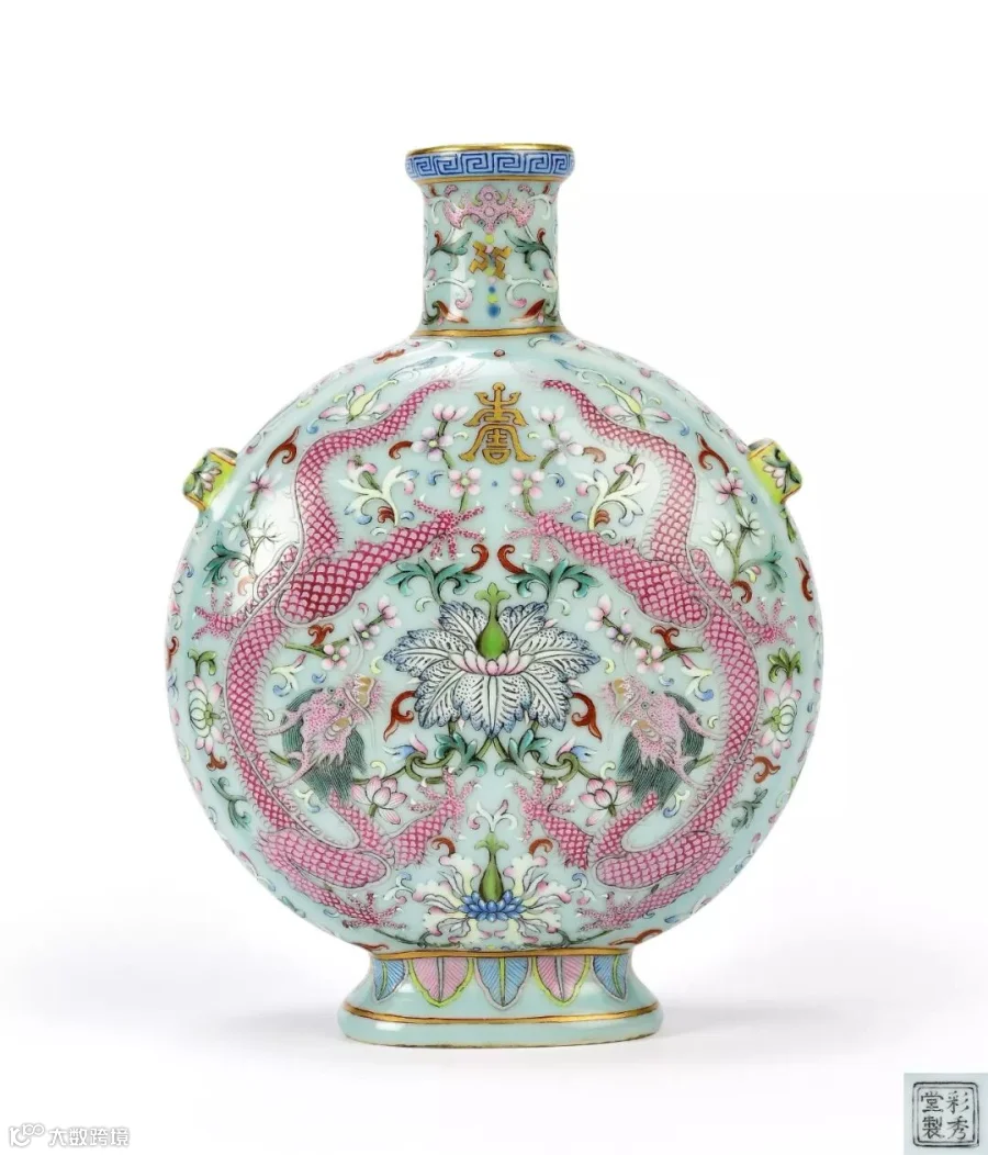 拍品青釉为地,器身以粉彩绘双龙捧寿纹,双龙相对,拱绕缠枝宝相花,花上作金彩寿字。纹饰吉祥,寓意福寿万年、福禄万代。