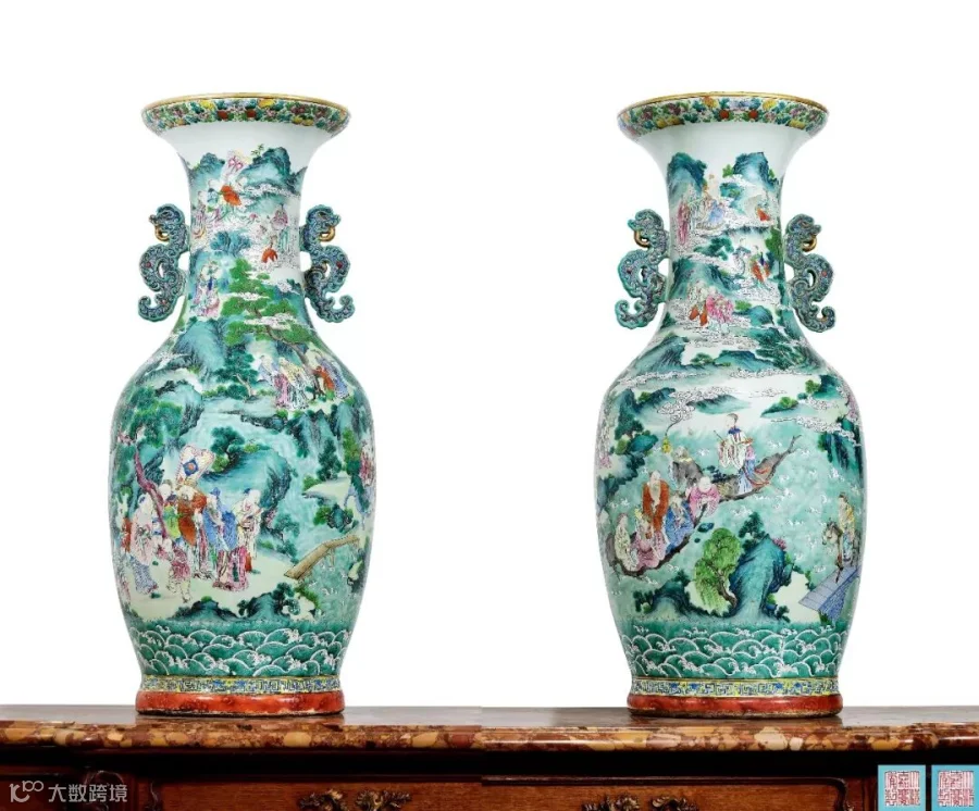 清嘉庆 松石绿地群仙祝寿盘口大瓶一对