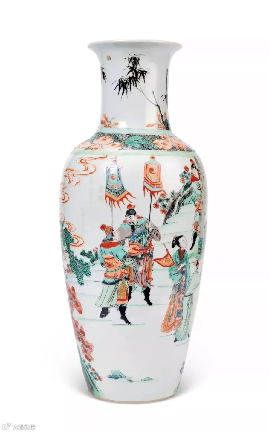 拍品器身高大,唇沿外敞,圆足微撇,因其形似观音菩萨亭亭玉立,故有“观音尊”之称,是康熙时期流行的瓶式。本品设色浓淡相适,静雅相宜,瓶身绘人物故事图,人物形态各异,场面生动传神,构图疏密有致,纹饰画工细致流畅,画工娴熟,笔意流畅,此瓶整体色彩深厚、鲜明、华贵、夺目,用色考究,为罕见的康熙官窑珍品。