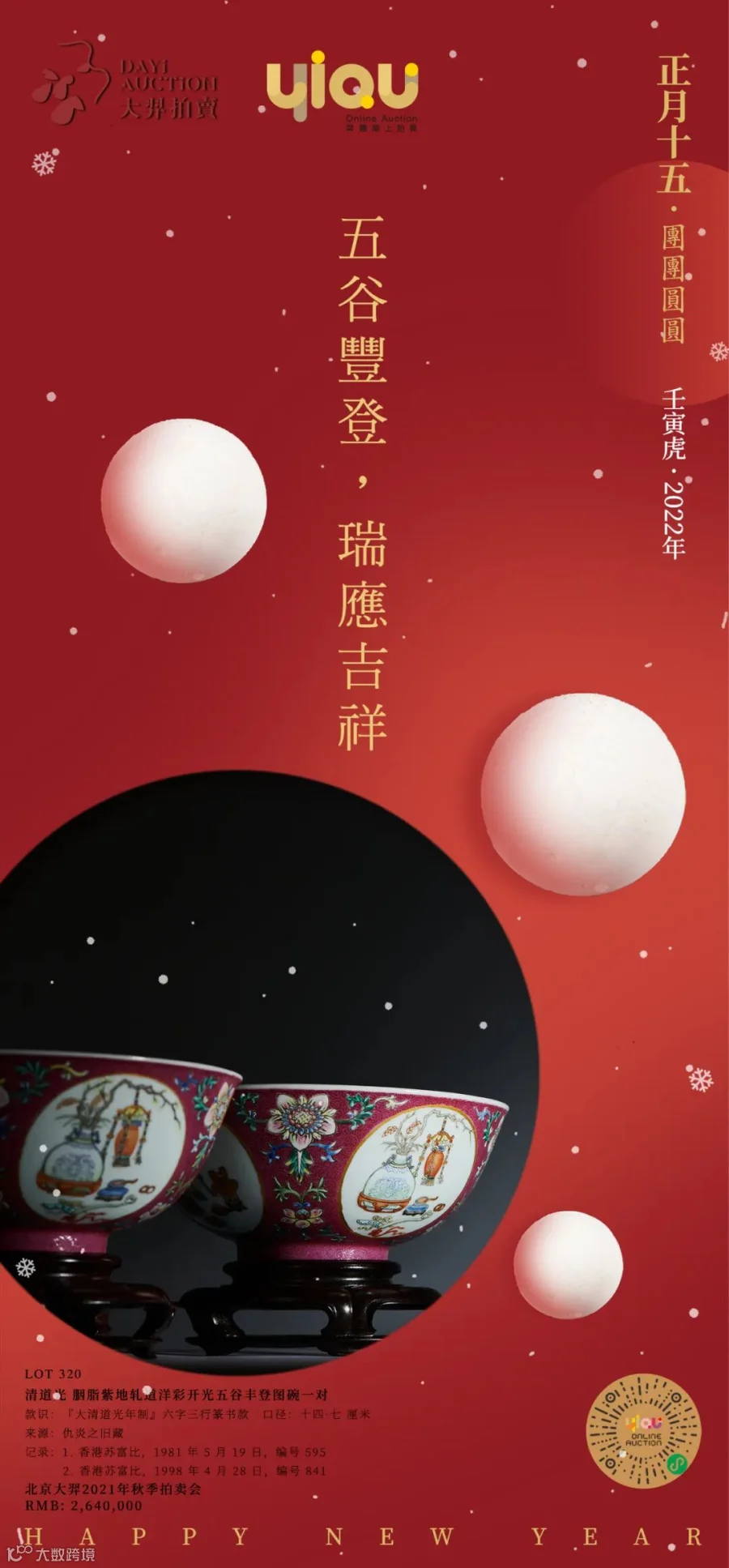 在这个花好月圆之际,北京大羿拍卖及北京羿趣国际拍卖恭祝各位元宵节快乐,在新的一年里刻刻充满朝气,时时高兴欢喜,日日喜悦无忧,月月事事顺心,年年圆满如意,月圆人圆花好,事顺业顺家兴!
