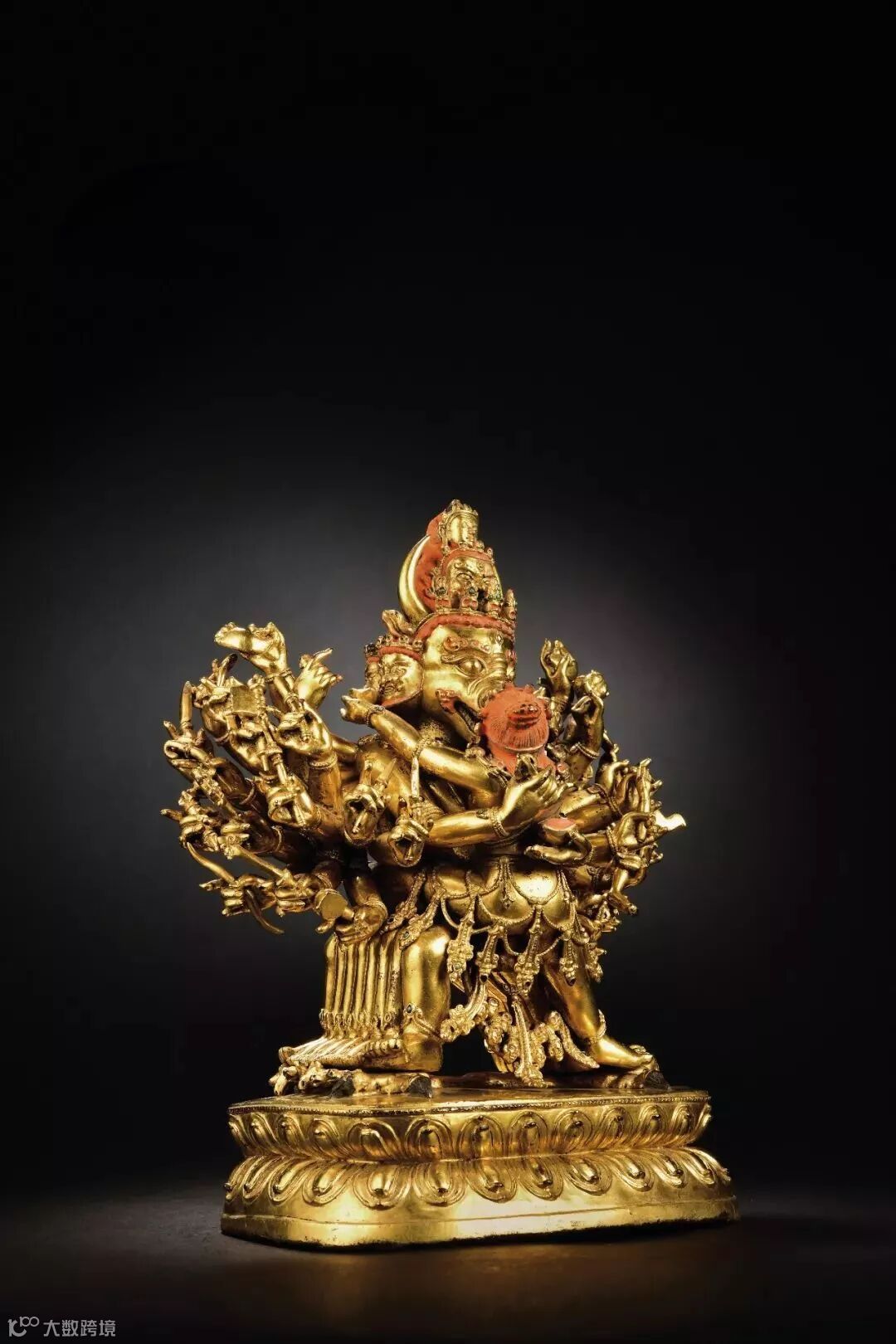 这尊结构复杂、造形精美的铜鎏金造像表现的是大威德金刚的形象。大威德金刚是藏传佛教中非常重要的密修本尊,以此为题材的唐卡造像作品并不少见。但这尊大威德金刚造像在造形工艺、年代、体量等诸多方面皆出类拔萃,是同题材作品中的精品之作。在此次大羿秋拍佛教艺术品专场的中作为封面拍品呈现给大家,堪称本场压轴重器。