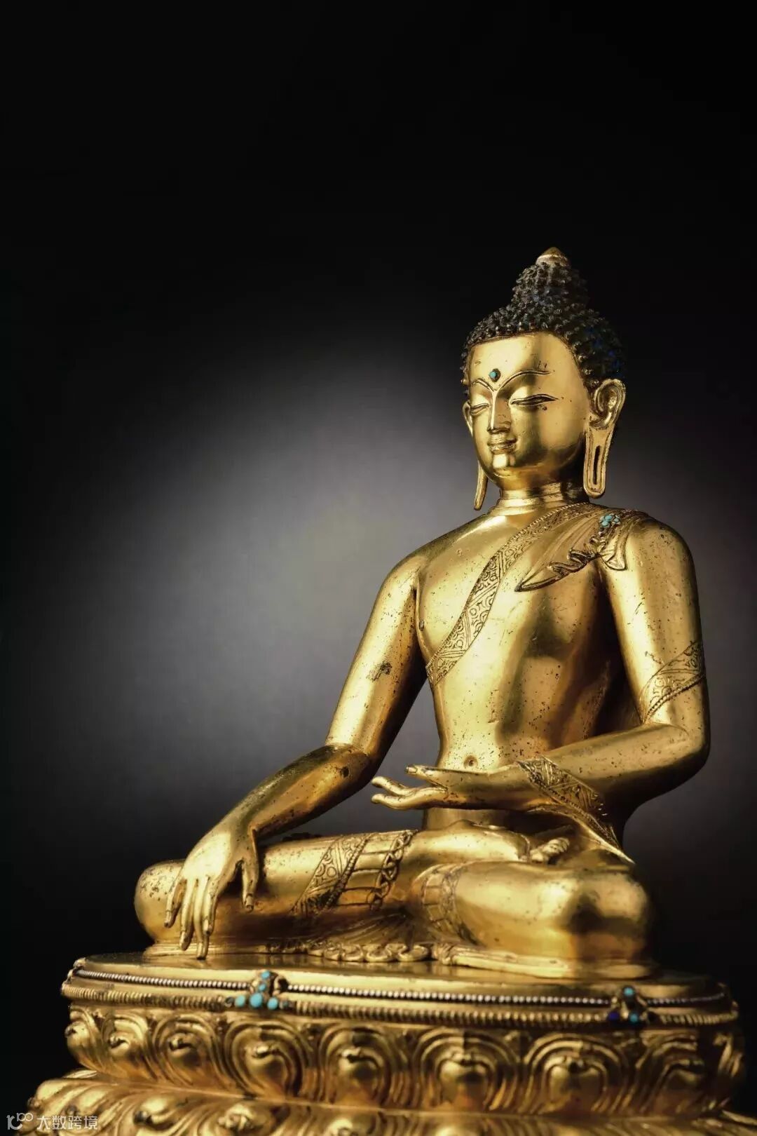 整尊造像体量颇大,金水亮丽,并在台座上沿镶嵌白银松石,保存完好,雕塑工艺洗练简洁,对于身体情态,完美和谐的精准把握,使佛像洋溢著充沛的活力,达到生动传神的艺术效果。其秀美的开脸,微垂的双目,嘴角扬起的笑意,映射出佛陀静谧慈悲的内心世界,使人见后即心生欢喜。从造像整体艺术风格和制作工艺来看,此尊释迦牟尼应为十六世纪西藏中部地区大型寺庙的造像佳作。