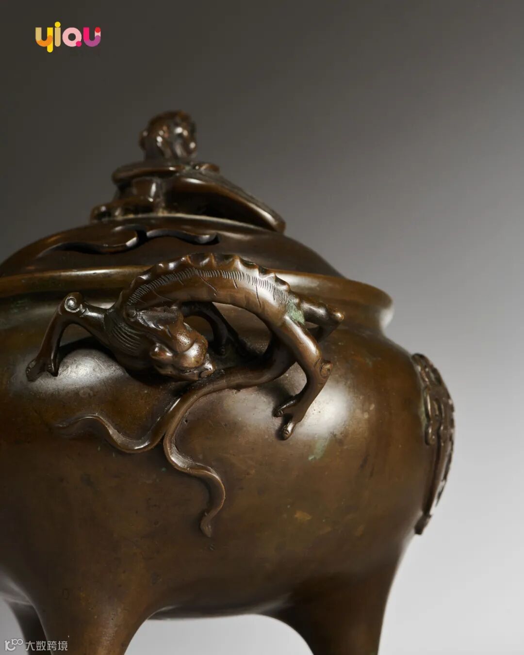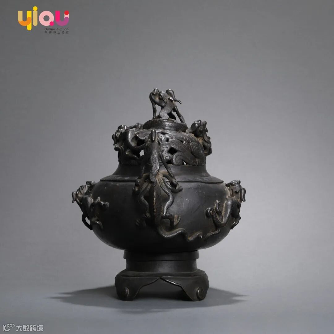 此件熏炉体量甚巨,造型稳重。高腹深膛,炉身浮雕云龙纹,盖为镂雕云龙纹,以做出香口,炉顶钮为蛟龙,双耳两条躬身回首螭龙,怒目四足盘于炉身两侧做耳,腹徐徐下收,下呈兽足,敦实有力,上下呼应,口沿密实,下配底座以承之。通体以颈部一周卷云回纹,分界视之。炉腹外壁运用浮雕技法雕饰云龙纹,所雕龙纹形象生动,龙首宽额饱满,须发张扬,鳞片清晰,龙爪矫健有力,似穿梭于云间雾里。整体造型规整硬朗,线条流畅,纹饰錾刻精美细腻,层次分明,繁而不乱,气势非凡,时代特征十分突出,颇见匠人之功力。官器逼人,铸造工艺极其繁复,仔细观之,此炉全身修饰皆有皇室之风。堪称收藏佳品。