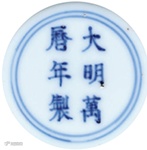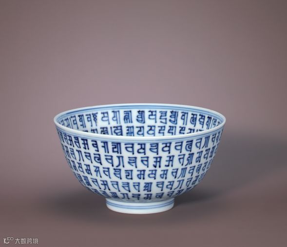 拍品整体以青花梵文作装饰,碗心为一巨大 梵字;碗外侧亦用相同手法饰梵文修饰,碗 底落“大明万历年制”款。瓷器上出现梵文, 始自明代,梵文原系古印度一种书面语文字, 后用以书写佛经。明代御窑为配合朝廷的佛 法活动以及与信奉佛教的藏族上层贵族交往,烧造出了以梵文作纹样的瓷器。