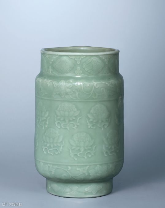 本品造型敦实端庄,气息古拙浑厚,自上而下模印凸雕五层纹饰,颈部与圈足外墙 各饰缠枝花卉,肩、胫均饰团花,腹部主题纹饰为两层缠枝莲花,上下交错排列。 与同一时期的青花瓷器纹饰一致。其制作工艺娴熟,技法流畅,纹样清晰,质感强 烈,所见缠枝莲花轻盈舒展,神采奕奕,尤其莲蓬细节充分表现出来,逼真写实, 无不彰显出窑工的非凡造诣。其釉厚腴温润,碧翠怡人。圈足裹釉,内留涩圈一周, 为垫烧所致。其品质上乘,气度严谨,当属明代处州龙泉官窑之佳器。