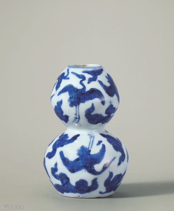 此瓶呈葫芦状,瓶身绘仙鹤纹,姿态飘逸,柔静幽娴,与天 地同休,与日月同寿,寓有长寿安宁之意。