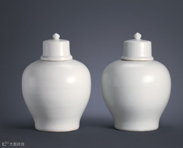 腹部浑圆,腹下渐收,器形敦厚。两只器身分饰暗刻龙凤纹,器身施白釉,釉色 晶莹白润,给人一种甜美的感觉。上海博物馆陶瓷研究部主任陆明华先生曾于其 所著《上海博物馆藏品研究大系 • 明代官窑瓷器》中即述及“嘉靖仿永乐白釉罐”。其端庄秀美的体态,恬淡匀净的色泽,含蓄柔润,如白云出岫,似皓月当空,是明中期白釉瓷器的典型作品。