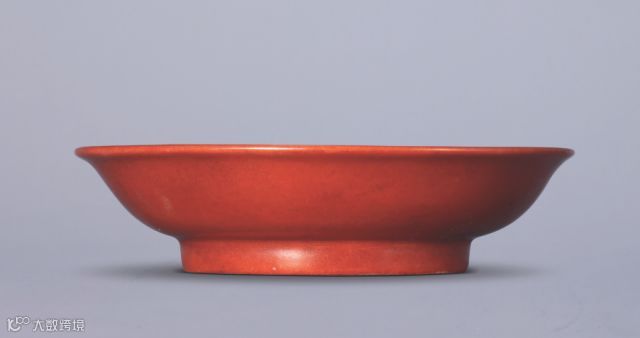矾红,亦称“铁红”、“红彩”、“虹彩”,低温釉的一种,色泽红中泛橙。 南京市发现的洪武官窑红彩云龙盘可以认为是景德镇窑红彩器的开端。 此盘敞口,口沿向外微卷,弧腹,平底,盘底宽平,浅圈足,器形圆润周正, 敦实古朴。