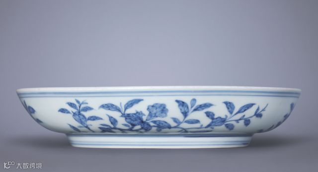 盘弧壁圆滑,敞口圈足。隽永蕴藉,犹如华葩半开,臻埏埴之巅。淡蓝宜漫抹,浓青善勒骨。 外壁巧绘四组折枝花果。