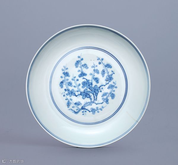 柔瓣散舒,幽芳怒绽。盘心一株寒梅做折枝团花式,框双圈, 冷香幽韵,比君子傲骨淡泊之气。与外壁姿影稍异,更添意趣。盘沿里外、足上各缀弦 线二道。通体釉料透亮若脂,触感润泽如玉。足底满施白釉无款。