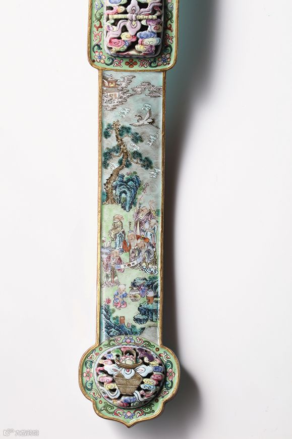 中腹及尾部,皆饰绿地花卉纹开光,开光内镂空凸雕粉彩云纹,云纹上分别饰阴阳板、笛子及花篮。柄身以粉彩绘神仙故事图。高山行云,苍松翠柏之间,仙人布置错落,姿态各殊,或回首、或仰视,或持物而立,衣纹拂动,神情闲适,有仙家道骨之气度。周围仙鹤翱翔,灵动而富有生机。