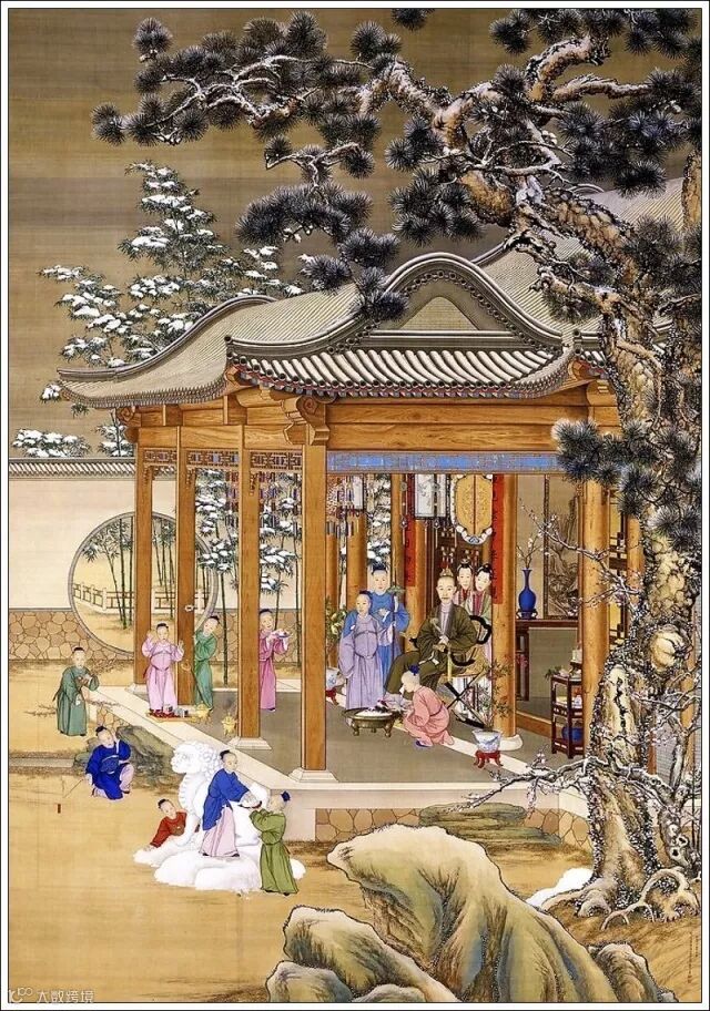 北京故宫博物院藏郎世宁等作《高宗岁朝行乐图》 见乾隆皇帝手持如意