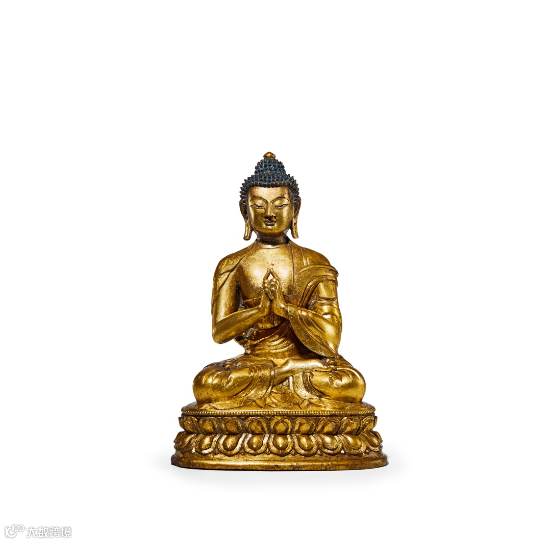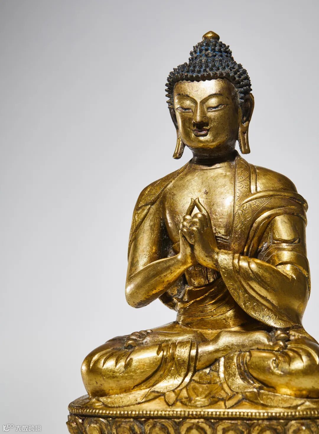 大日如来,又名“毗卢遮那”—梵文为“遍一切处”,佛经中指出他是释迦牟尼的法身佛,是表示绝对真理的佛身,象征光明理智。此尊大日如来造像,头饰螺发,肉髻圆隆,饰以蓝彩,宝珠顶严。面型方圆饱满,弯眉细长,身披袈裟帔帛,衣纹流畅,具有立体质感。肩膀宽厚伟岸,腰部收束纤细,对比强烈,力量感十足,结全跏趺坐于莲座之上。双腿间翘起的裙角褶皱卷翘,生动灵逸,凸显工艺高超,可谓柔美至极。双层仰俯莲莲座亦颇为精美,通体鎏金,金水厚足莹亮,工艺精湛,造型柔美,为大日如来佛之化身示现。整像品相上佳,用料之殷、鎏金之完美,均可说明其级别甚高,是一件极其值得收藏的精品艺术佳作,可遇而不可求。