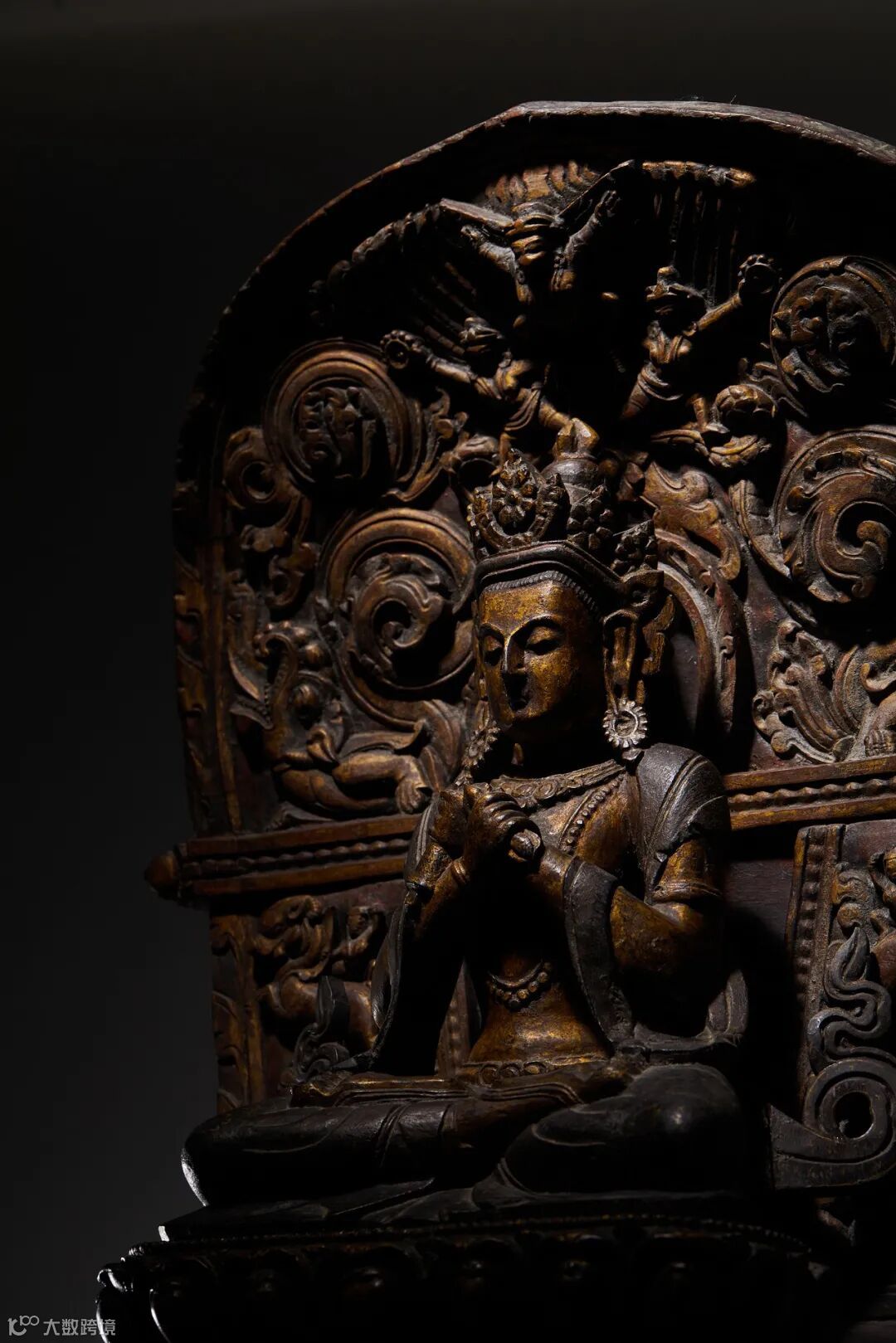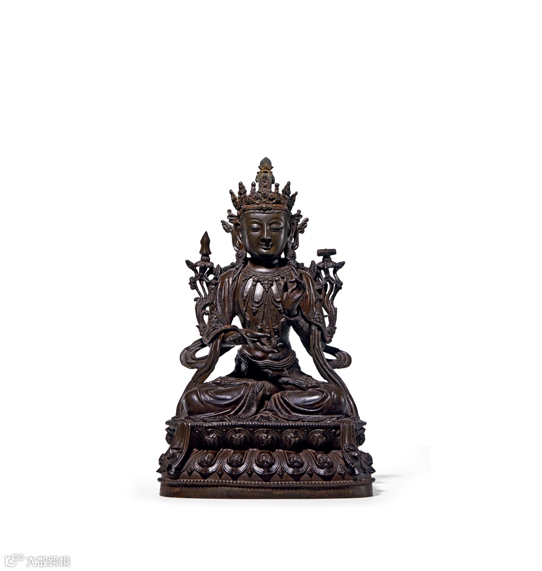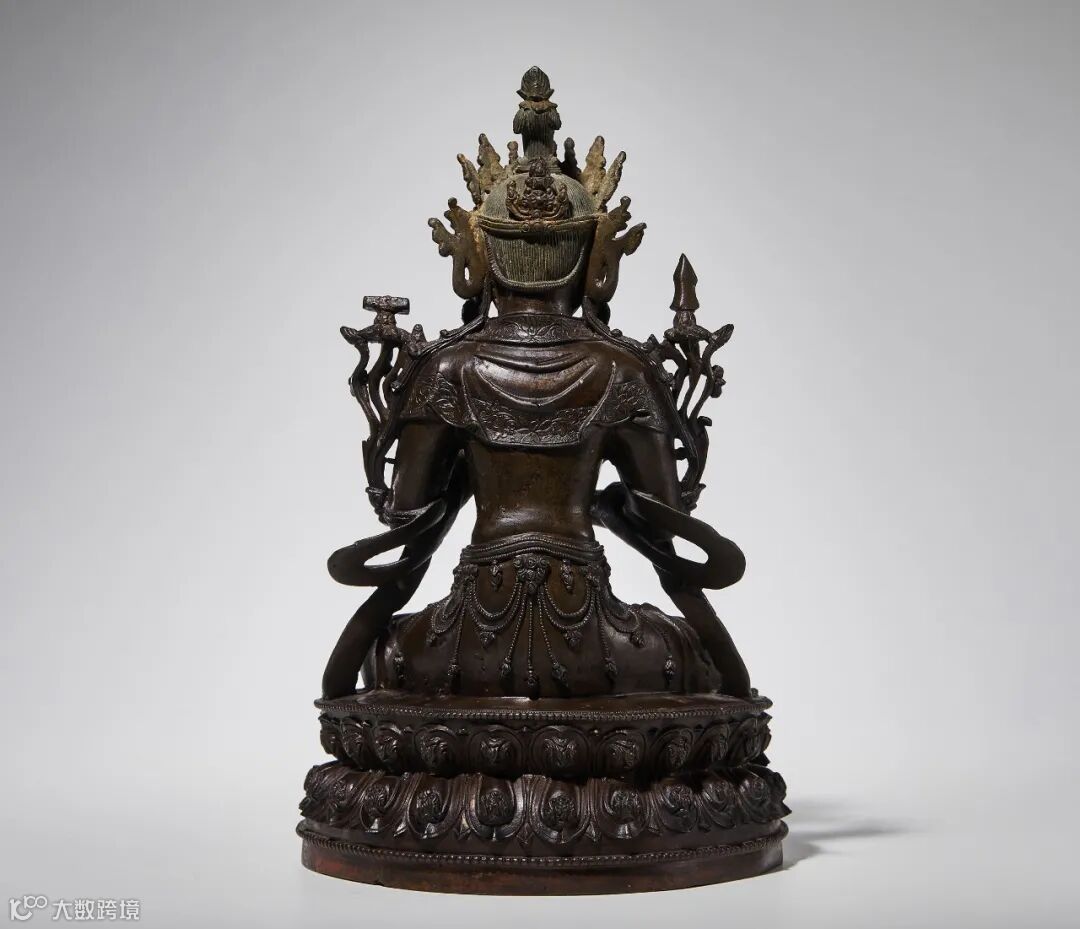 表情刻画颇为简练大气,头部微微低垂双目微合,柳眉弯月,鼻梁细长,小嘴微闭,面容安详,平静和睦,流露出恬淡宁静与聪慧的神态,似在俯览尘世众生。腹部紧收,肌肤好似富有弹性。帔帛质地轻薄,于身侧飘扬,如梦幻之仙境。衣纹流畅,自上而下,渐平展于莲座之上,如行云流水。结跏趺坐于莲花座上,莲瓣修长饱满,环绕周身,尖端上卷呈卷草花蕊状,精美细致,颇衬整像雍容华贵之态。整像铜质精炼,久经沧桑的皮壳呈现出浓郁莹润的包浆,造型端庄动态舒展,技艺的纯熟在华美的璎珞与装饰中自然流露,具有极高的艺术性,殊宜宝之。
