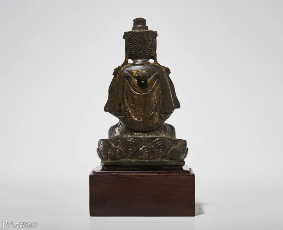 此尊观音坐像具有鲜明的辽代的造像风格,造型生动古朴,以精铜熔铸为材,头束高发髻,面相祥和,饱满圆润,双目低垂,嘴角内含,眉目婉好,给人慈祥之感。躯体敦厚,体态匀称,线条柔美有力。身披繁美璎珞,自然垂于莲台,观音跏趺坐大莲座上,莲瓣错落堆叠,排列有致,足可见工艺之精湛考究,使造像显得格外高贵典雅。两臂与身躯分铸,故易脱落散失但在岁月洗礼之中,此般损失在所难免,并不能损其艺术价值。此像将观音端庄娴雅之形象表现得淋漓尽致,极富神韵,集中体现了“崇雅反俗”的高度审美意趣,在著名文物专家、收藏价王世襄先生收藏品汇集——《王世襄集》中亦有同款观音坐像记载于册,可谓难得,也恰恰证明了此尊造像非同一般,可堪珍视入藏。