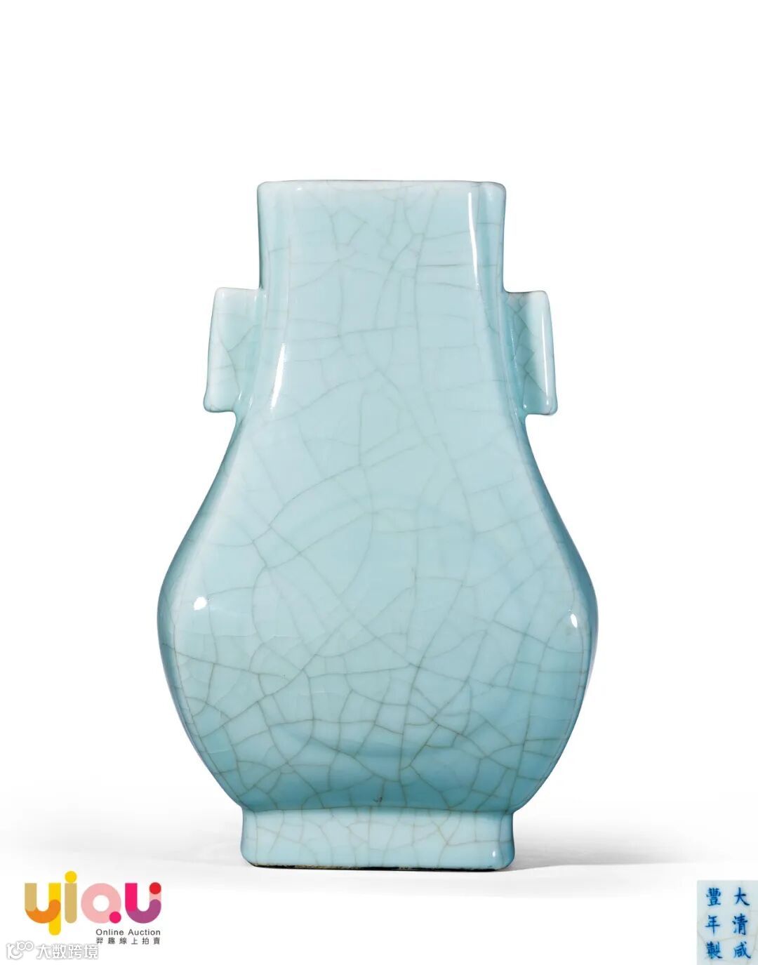 拍品为清代御窑仿宋釉典型器,瓶形制周正,挺拔大方,口呈四方倭角形,颈部对饰双贯耳,腹部饰两个杏圆凸起,通体施仿哥釉,釉色肥腴莹润,开片清晰分明。此式贯耳瓶始烧于雍正时期,其后御窑继续烧制。