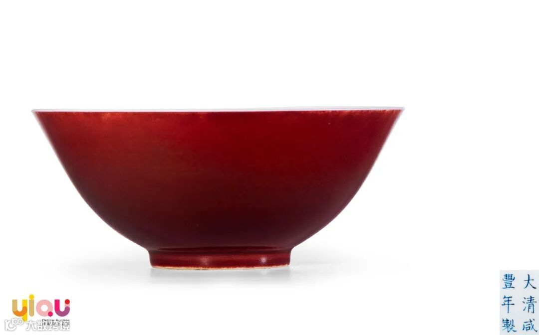 霁红釉碗为宫廷日用器,清代御窑历代均有烧造,咸丰朝政局不稳,战乱频发,故而御窑瓷器烧制较少,存世不为多见。这个时期的红釉中含有粉釉,似红芸豆色。这种红釉在乾隆、嘉庆时,民谣已有制作。咸丰是常用这种釉色制作玉壶春瓶、碗、盘等。