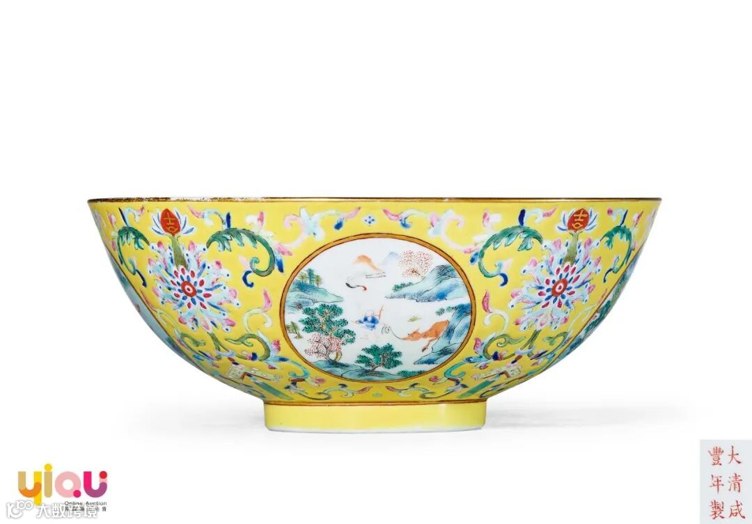 LOT324 清咸丰 黄地缠枝宝相花开光粉彩山水图碗