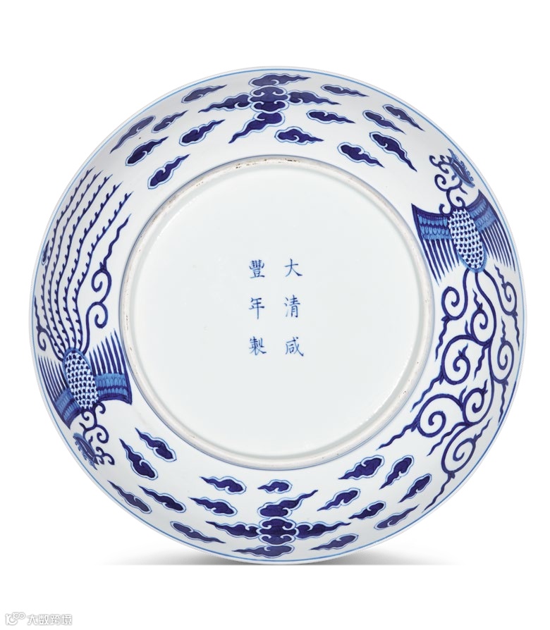 拍品敞口,浅弧腹,圈足,器形规整。釉质细腻温润,器形织巧,白釉泛青,青花色泽青翠,盘心及外壁以青花绘双凤纹饰,附以祥云纹饰,纹饰流畅,构图紧凑,样式优美,此纹饰俗称“对头凤”,是清代官窑瓷器的传统图案之一。器底书“大清咸丰年制”六字双行楷书款,排列整齐,字体工整。