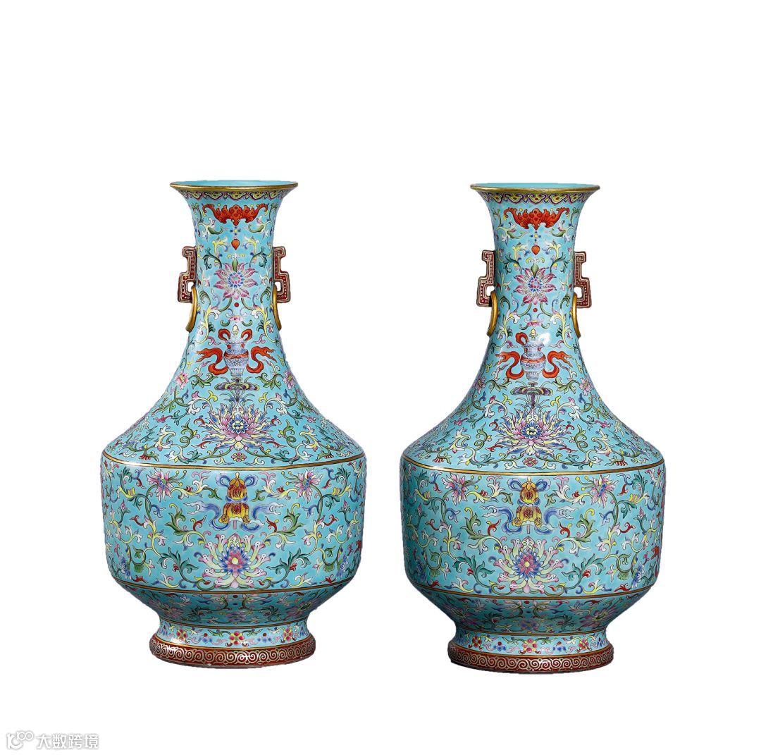 7.Lot 307 清嘉庆 松石绿地粉彩莲托八宝纹双环耳瓶(一对)