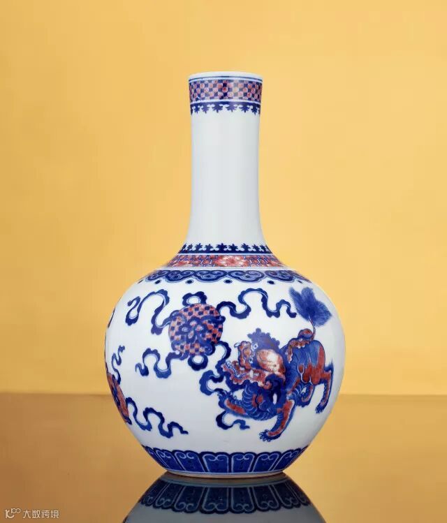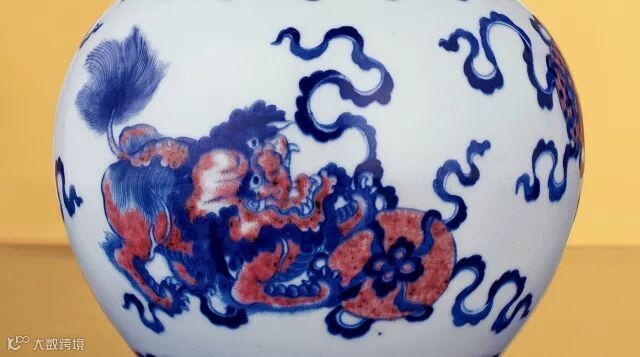 『獅球紋』:又稱『獅子戲球』,即力量與權力的結合,為中國古代藝術品喜聞樂見的裝飾,尤得皇家所愛,在瓷器上以明代宣、成二朝官窯獅球碗罐最為著稱,本品瑞獅形象較前更為寫實入微,動感強烈。以青花釉裏紅來裝飾獅球紋則是乾隆壹朝的首創,體現彼時榷陶禦窯廠銳意創新,勇於探索的新風。