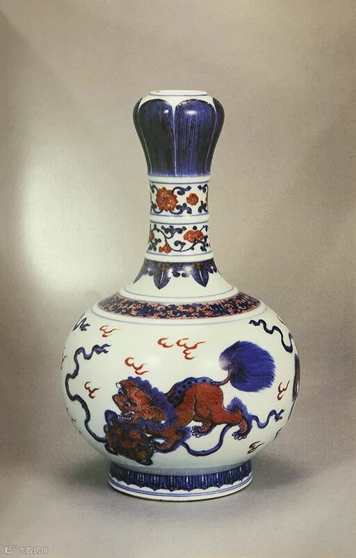 此瓶直口較粗,圓腹,假圈足。外壁以釉裏紅和青花相間繪以紋飾,口沿及肩部各飾以錦地及如意雲頭紋,瓶腹繪獅球紋,獅子神態靈動,活靈活現,底部飾蓮瓣紋。底青花書『大清乾隆年制』六字三行篆書款。
