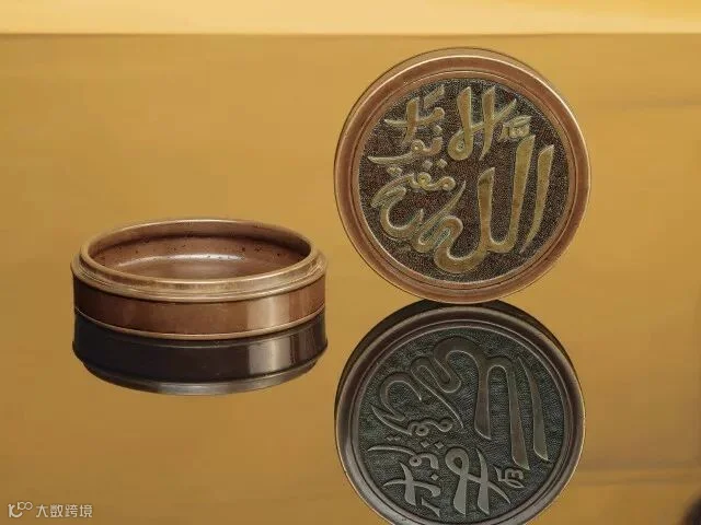 銅盒蔗段式,子母口,盒蓋面外緣壹周打窪,內部圓形開光,以魚子紋滿佈,上有阿拉伯文。銅盒與瓶皮殼類似,外皮因年代久遠,相對較淺,與銅色融合,紅中透黃。盒內色深,原貌畢現。