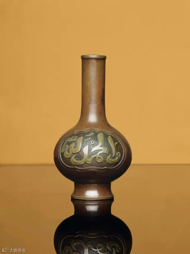 銅瓶圓唇口,長頸豎直,圓鼓腹,下承高圈足,足底加以狹邊。瓶身雙面花式開光,外形與銅爐壹致,內部裝飾阿拉伯文,輔以魚子紋地。瓶身紅潤皮殼,圈足內裡可見銅皮本色,棗紅至深,暗沈凝重。