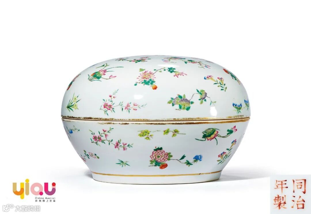 盒硕大饱满,颇具气势,白釉为地,口沿及足胫皆描金边,外壁上以粉彩绘折枝百花图,玉兰、荷花、牡丹、芙蓉、莲花、兰花、芍药、水仙等各色花卉,姹紫嫣红,群芳争艳,绿色枝蔓,互不相连,取百花献瑞之意。全器纹饰布局匀称,密而不乱,施彩清丽,别具一格。底书“同治年制”四字双行楷书款。