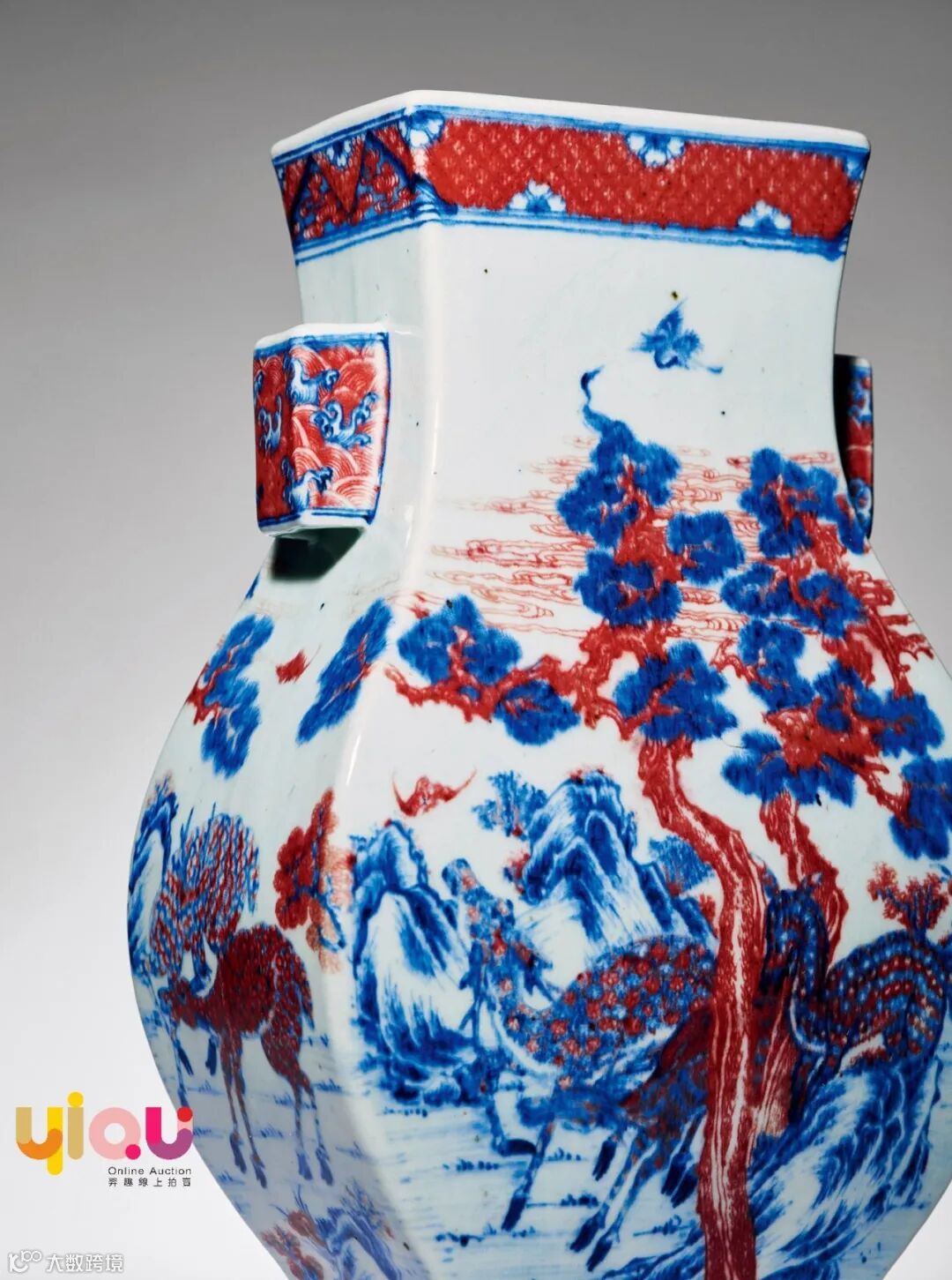 拍品器作四方,造型沉稳,器形庄重。腹部通景满绘青花釉里红鹤鹿同春图,画面构图丰满,青花与釉里红发色雅致。整器气韵生动,适于陈设。整器纹饰多以青花为之,间以釉里红填绘,色泽明而不媚,妍而不娇,画面气格淡逸、穆穆生韵。观其釉色,青花与釉里红两者互为主次,可谓变化多端,搭配转换之妙,令人叹为观止。