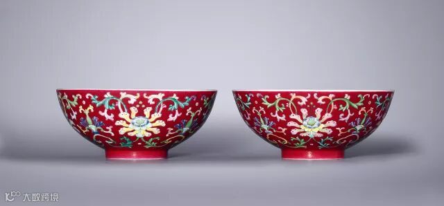 清乾隆 胭脂红地洋彩缠枝花卉纹碗(一对)