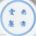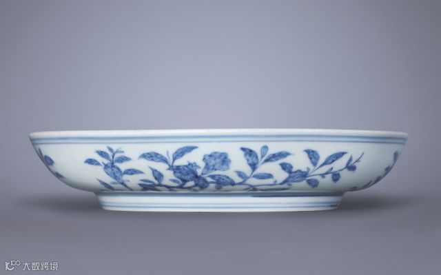 此盘外壁巧绘两组花卉,枝叶蜿蜒曲回,柔瓣散舒,幽芳怒绽。盘心绘梅花框双圈,采取双线勾勒填色之法绘就,笔触细腻纤巧,内外青花发色淡雅柔和,荡漾着一股阴柔隽秀之气,予人以清新悦目、超逸脱俗之感。通体罩施釉料,透亮若脂,润泽如玉。