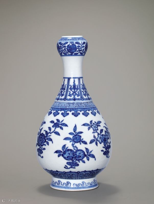 蒜头瓶因瓶口形似蒜头而得名,最早见于战国晚期秦国青铜器之中,明清两代景德镇御窑厂皆有仿制。此瓶蒜头形口,长颈微束,溜肩鼓腹,高圈足略外撇,造型挺拔俊美,胎质细腻坚实,釉面平整温润。瓶通体以青花描绘,口肩分饰回纹、缠枝花卉、莲瓣及如意云头等五条纹饰带,腹部主体以“三多”为主题纹饰。本品造型端正大气,恢宏威严,青花发色苍翠,为乾隆御窑不可多得之臻品。