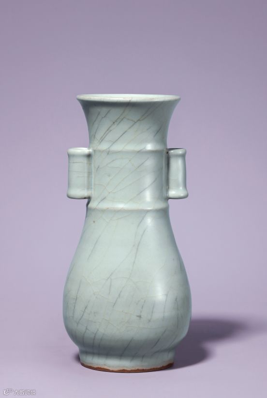 贯耳瓶这种造型最早来源于青铜器,是由上层贵族投壶的活动演变而来。本品器形端庄挺拔,秀美隽雅,通体覆施青釉,厚润沉静,碧翠怡人,光敛内藴,类玉似冰,扣之有金石之声,所谓“青如玉,明如镜,声如磬”应是如此。颈部两道弦纹,两侧置贯耳。胎质细腻,胎体较厚而不笨重,造型大气古朴、典雅高贵,为龙泉官窑贯耳瓶之佳妙隽品,无怪乎明晚期赏鉴家高濂评价龙泉窑:“妙者与官窑争艳”。龙泉官窑瓷器以其端庄大方的造型,精光内蕴的釉色,匠心独到的紋片,细致纯熟的工艺,代表着中国古代青瓷生产的巅峰水平,被称为“瓷器明珠”。