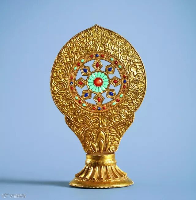 拍品与台北故宫博物院藏清嘉庆描金瓷法轮几近一致,为仿铜鎏金嵌宝石法轮而制。器身由轮盘和器座两部分组成,上下连为一体,轮盘外廓似桃形,中轴与外廓之间以八个菱形辐条相接,象征佛祖释迦牟尼一生传教的八件大事。法轮通体施金彩,彩下模印凸起的卷草、莲瓣等纹饰,轮心施红、蓝彩釉,模仿青金石、松绿石、珊瑚等天然宝石形象,鲜艳明丽,效果逼真,是清代官窑瓷器以瓷仿其它工艺的典型制器。